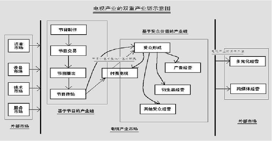 将电视产业链分为两个部分,即基于节目价值和增值的产业链和基于受众价值的产业链(见下图)。 这一理论创新廓清了产业链中核心资源是节目还是周中的观点争议,以凝练、准确的结构图提供了一个简洁的分析模型。