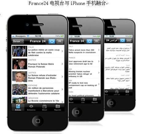 实际上,从2009年3月起,France24就推出了在智能手机(包括iPhone)上运行的France 24 Live程序,它以MOBICLIP的视频发布平台(VDS)技术为支撑。到2010年7月该程序的下载数量已经超过了一百万大关。而其下载量的80%是在法国境外实现的。欧洲占了大概50%,非洲20%,北美15%,亚洲将近15%。
