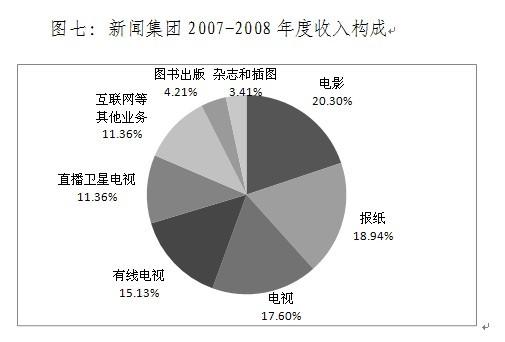 事实上,西方传媒巨头奉行的多元化经营策略就是谋求品牌协同竞争的典型范本。在西方,电视产业的跨媒体、多元化经营成为了一种趋势,特别是在台网融合的条件下,以BBC、CNN等媒体为典型代表的西方国家的电视产业发展日趋多样,很少有绝对依赖单一产品收入的现象。一般而言,传统电视台广告收入只占整个媒介集团收入的40%,跨媒体经营所带来的增值服务收入却在不断增加,整体品牌市场竞争力在逐渐增强。由此形成了以电视台为旗舰、多媒体综合发展的跨媒体集团。以新闻集团为例,2007-2008年新闻集团直播卫星电视、有线电视和电视的收入之和只占其年度总收入的不到半成,而其他收入则超过了半数,如图七所示: