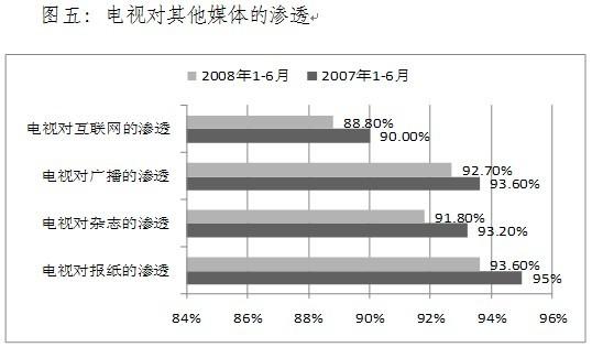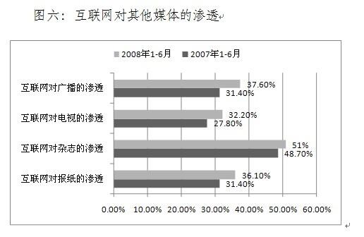 在台网融合的建设中,传统电视与互联网可以利用彼此渗透的相互关系,广泛开展与商业网站、电信运营商在内容渠道建设方面的合作,拓展用户渠道。从媒体渗透比例(A媒体对B媒体的渗透比例是指在昨天接受B媒体渗透的受众中,同时接触A的人数比例)来看,根据2008年中国城市居民调查的数据,电视与网络的渗透关系如图五、图六所示: