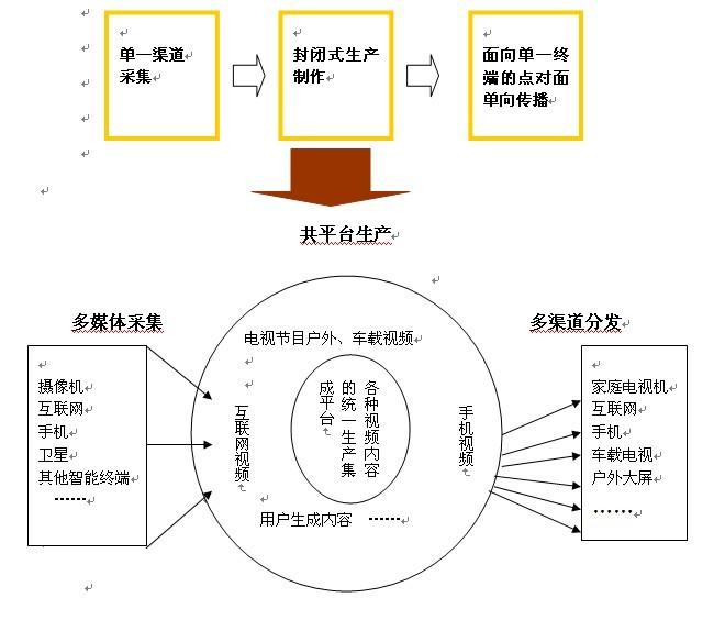 在全媒体时代,电视媒体应从“单一渠道采集、封闭式生产、点对面单向传播”的制播模式向“多媒体采集、共平台生产、多渠道分发”的全新制播模式转变,如下图所示: