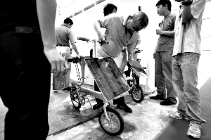 福建展团展示的太阳能电动车一次能行驶70多公里。