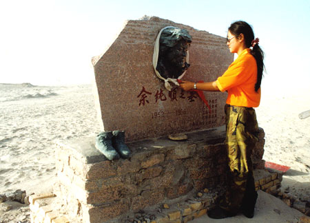 你是唱着歌走来的,你是数着星星走来的,向你致敬,献上我的红领巾。"徒步走中国的壮士余纯顺" 的墓静静的耸立着,仿佛在聆听那呼啸的流沙。当我献上我的红领巾后,突然风起,流沙一下活了起来,这时听到队长大声的喊起来--沙尘暴快来了。赶快离开。