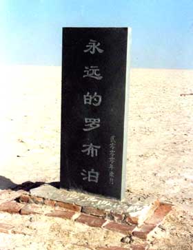 此处是罗布泊湖心,立有永远的罗布泊一碑,碑后刻着愿罗布泊现象永不发生。