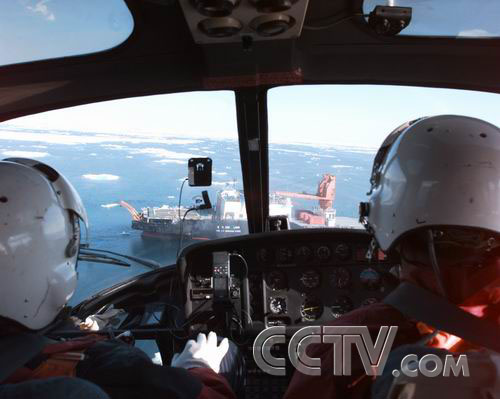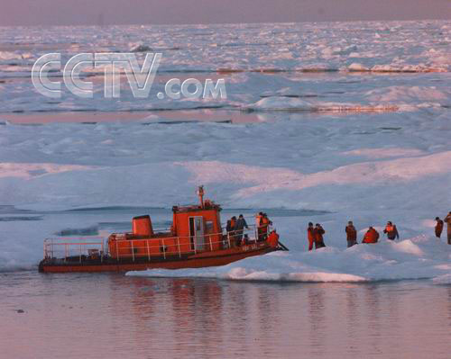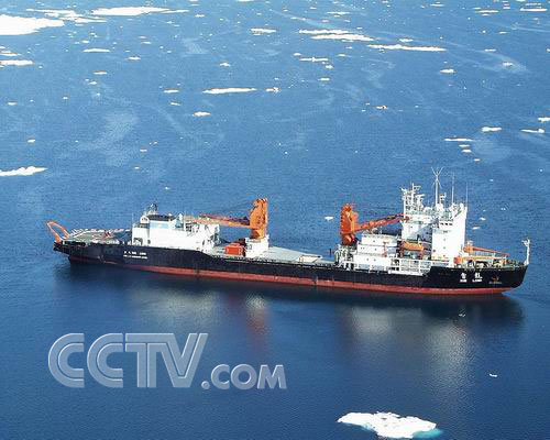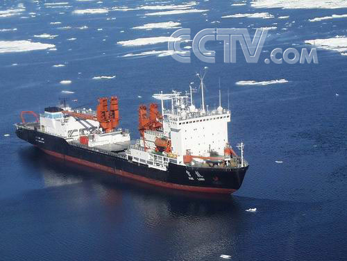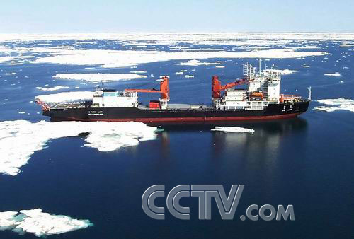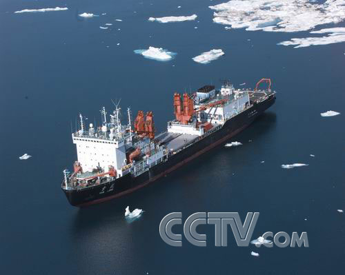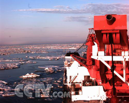 雪龙移进楚科奇海浮冰区