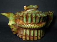| 岫玉茶壶 | 又称岫玉,形成于镁质碳酸岩的变质大理石中,全国最大的蛇纹石玉矿在辽宁省岫岩县哈达碑镇瓦沟,岫岩玉以绿色为主,还有红、黄、白、青、蓝、紫色和墨绿、淡黄、乳白色。可谓七彩斑斓,五光十色。硬度一般介于3.5度至5度之间。