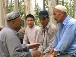肉孜老人(左一)和村庄里的收玉人打招呼 |