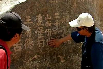 就在大家已难以忍受的时候,我们终于到达目的地。一个当地老乡告诉我们,他说这里发现了一块清代的石碑,上面还有当时采玉人刻的字迹。其实,他所谓的石碑不过是河床中一块两米多高的大石头,我们走近这块石头发现,上面的文字大都已看不清了,但“王友德山西忻州人在此受难”几个字却十分清晰。一个“难”字,道出了采玉人无尽的艰辛。