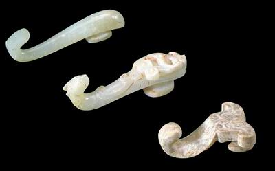 又名“犀比”。可能是我国北方游牧民族的发明,用以钩连腰带。带钩有铜、玉两种,流行于春秋战国和秦汉时期。河南固始在春秋末或战国初期墓中,发现一件玉带钩,是目前已知较早的一件。在河北满城、江苏铜山小龟山等西汉墓及河北定县北庄东汉墓中,均有玉带钩出土。