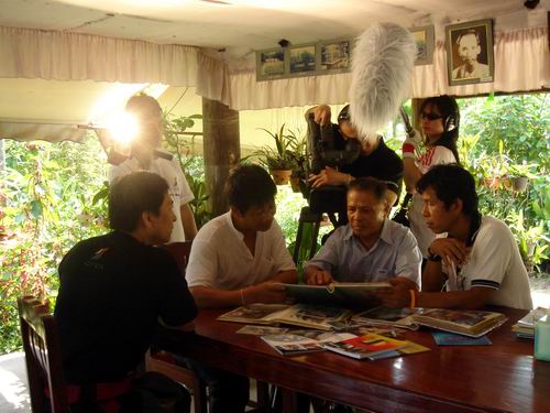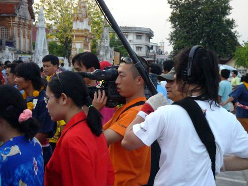 4月8日至4月18日我们摄制组来到了位于泰国边境湄公河畔的那空帕侬府,拍摄了付由当地色彩的泼水节。作为泰国每年最为盛大隆重的节日,在泼水节期间纳空帕侬府举行了丰富的活动。我们摄制组从节日前人们的准备活动开始拍摄了花车游行、“善行”、洗佛以及小孩出家等一系列活动。拍摄地点主要选在了帕侬佛塔、雷努那空县及湄公河河岸,并赴距那空帕侬15公里的胡志明村采访了武同超老人。“善行”在泰语中的意思是“吉祥”,善行活动是各家各户将象征着吉祥的白色细绳连接在一起成为一根长达几十公里的长绳。在那空帕侬“善行”活动则具有更加特殊的意义,帕侬佛塔的高僧会与来自老挝他曲的高僧一道将两地的长绳连接在一起,既象征着吉祥又体现了泰老人民的友谊。