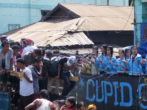 当然,泼水还是迎接新年最主要的活动。泼水节在缅文中称为“订间”,原意为“过渡”、“转换”之意。从13号到16号,人们都穿着盛装,尽情地泼水嬉戏。传统的泼水方式比较优雅,用樱桃花枝蘸取银钵中浸有花瓣的清水,轻轻地洒在亲朋好友的颈背部,以表示祝福。但现在更多的是热闹的泼水场面。很多人家在门口准备好水,随时“迎接”路过的人们。另外,在很多街道路口,都设有泼水站,一个个妙龄少女手拿水管,将水柱撒向台下出来游玩的人群和车辆,而台下的人们,或在街上, 或在车上,和着音乐,尽兴地跳着舞。值得一提的是,实兑的泼水站里还常常可以看到盛满水的木船,这船是人们在节前趁着海水涨潮时运上岸的。到泼水节时,少女们就把船里的水泼向站外的小伙子们,这也是男女青年自由择偶觅友的大好机会。