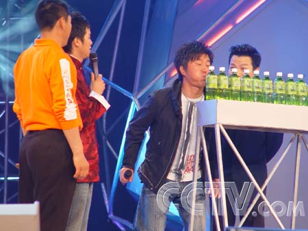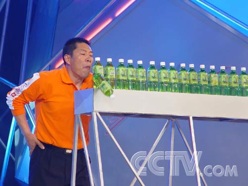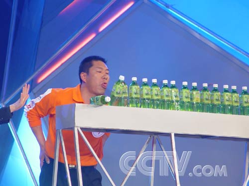 河北选手魏千贺人称吹瓶王,他带来的节目就是一个字“吹”。这个“吹”可不是吹牛,而是用嘴吹倒一瓶绿茶。说起来容易做起来难,嘉宾满文军、主持人任鲁豫吹得面红脖子粗都没能吹倒一瓶绿茶,而我们的挑战者一口气吹倒了40瓶,真是不看不知道,吹也能吹出世界水平。