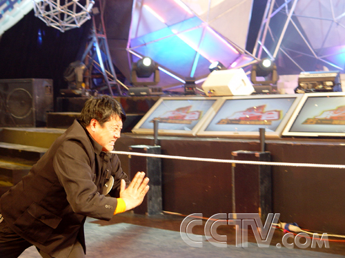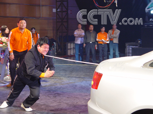 8号选手一亮相,羸得众人喝彩。因为他一口地道的“本山腔”,一身正宗的“本山服”,模仿赵本山惟妙惟肖。不过,他有一项绝活,却是赵本山学不来的,就是用喉咙顶汽车。赵本水用一根铁棍将一辆重达1.5吨的奥迪车,外加车上的三个成年人,顶了15米远。这项绝技令他最终胜出,成为今天两位获胜者之一。