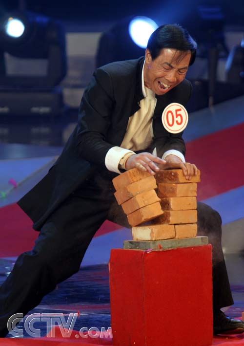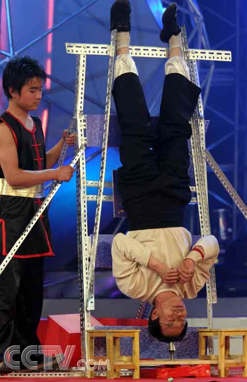 宋铁龙,五十二岁,河南堰师人,武林人称“铁掌大侠”,挑战项目:铁锥倒立(河南卫视选送)。倒立,把全身的重量集中到头上,立一钢锥上。钢锥!普通人马上脑浆迸裂!