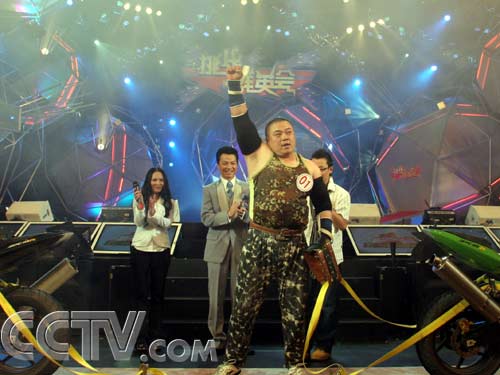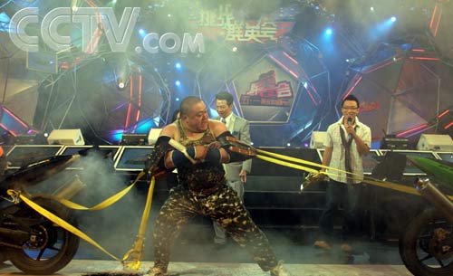 杨小平以力拔山河的力量,拉着两个开足马力的摩托车,让摩托车纹丝不动。而杨小平凭着这个盖世神功,获得今晚的挑战英雄称号。
