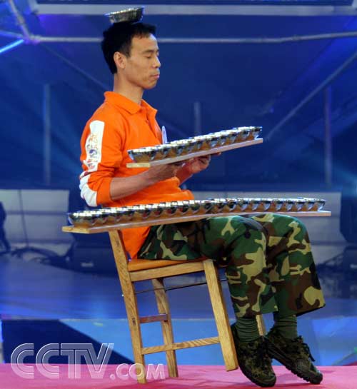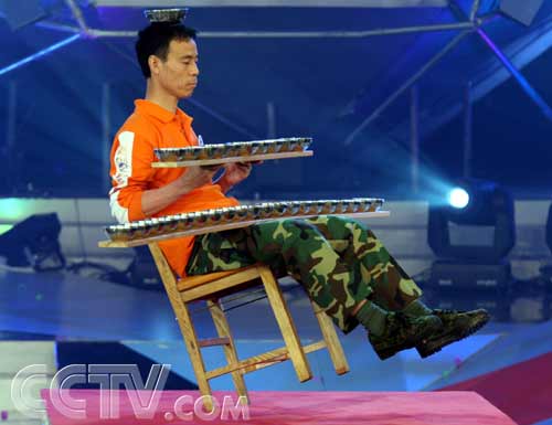 他今天要挑战的节目是平衡坐椅(中央电视台选送),时间120秒,以水不撒出为挑战成功。这需要一种定力,一种物我两忘的定力。