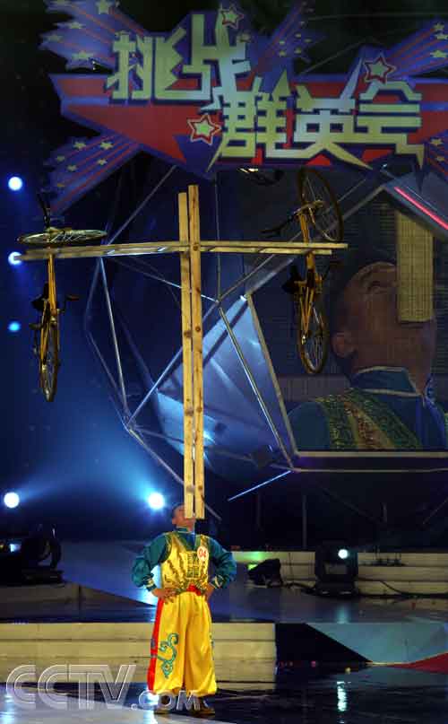 挑战项目:牙齿顶梯子(浙江卫视选送)。梯子上挂两自行车,合重超过100斤!