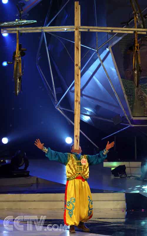 郭国直,十二岁开始习武,绝活:牙齿顶重--顶梯子、顶自行车、顶人、顶长板凳、顶啤酒箱,下巴顶重,耳朵顶碗。曾被评为"中国十大奇人",正为自己的顶技申请吉尼斯世界纪录。(摄影:梁钢)