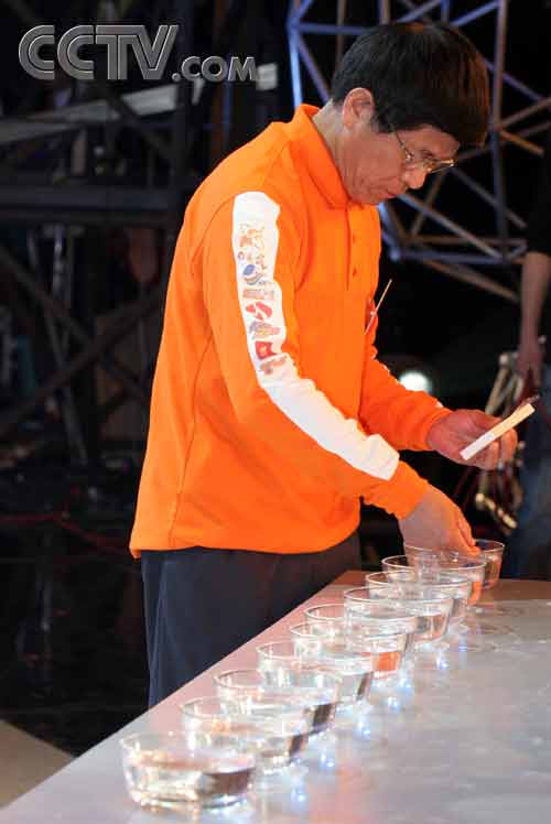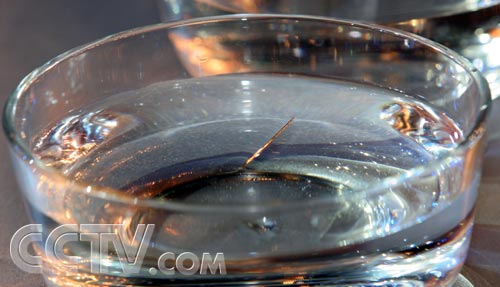 “我刚开始的时候这个手是从上面往下放针的,这样会破坏水表面的张力所以针就漂不起来。我回去就开始研究这个针就像硬币一样放的好也应该可以在水上面漂,我就试验了很多次,但是半个月我都没有试验成功”。踏破铁鞋无觅处,得来全不废功夫,“有一次,一个朋友来我家看见我在摆弄这个针就问我,在和他聊天的时候,不知怎么地,我的手就这么从下面一放针就给漂了起来。以后我又把这个绝活反复练,到现在已经两年了”。(摄影:梁钢)