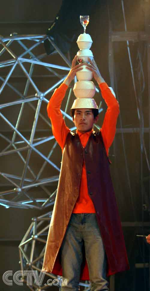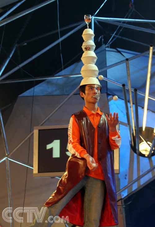 头顶九个碗一个杯,嘴里叼着一个杯,手里抛着三个球,你还能在只有脚掌宽的独木桥上行走自如吗?山东卫视选送的选手武龙就可以。而且他不但可以正着走,还可以倒着走呢。尽管挑战失败,但他确实呈现给了我们一次精彩缤纷的演绎。(摄影:梁钢)