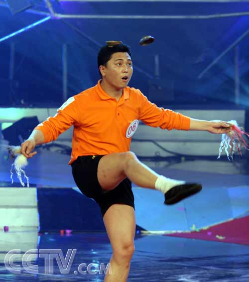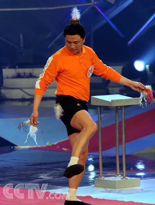 别看小小的毽子,也能玩出花样来。河北卫视选送的选手刘伟,玩起毽子比女子还要灵活。将从地上踢起毽子,让毽子落入头顶的小圆盘中。看了他的表演,不禁感叹脚也可以灵活到如此地步。可惜,也许由于灯光的干扰,也许是心理的紧张,最终刘伟没有完成挑战。可是也同样赢得了观众热烈的掌声。(摄影:梁钢)