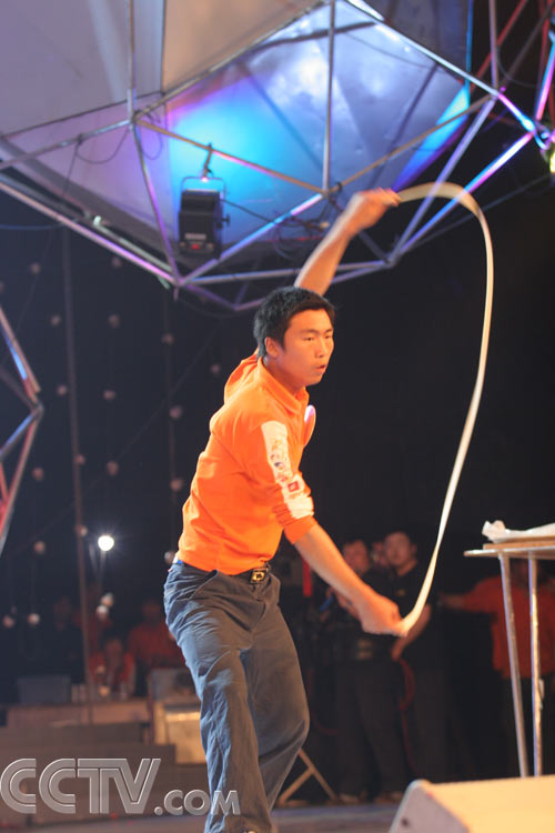 再想想一下,一个穿着T恤衫的大男生,手执长长的面条,伴着《喜刷刷》的音乐节拍,前甩后摔,舞将起来,不亦乐乎……这么经典的形象,属于且只属于吴何超,这个凭着自创的甩面舞在西安面点店小有名气、带了200多位徒弟的18岁男孩。