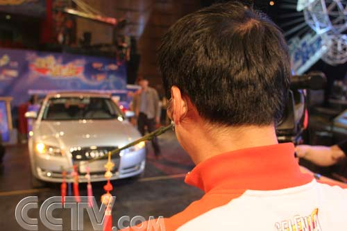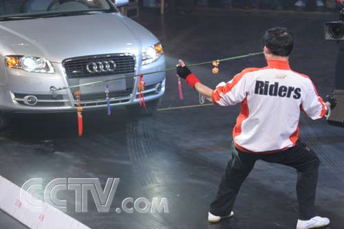 李希文曾经用耳朵拉动了5吨重的面包车,他说今天更具有挑战性,因为只用两个耳朵拉汽车,没有任何支撑点,所有的力量都集中在耳朵上,不比一只耳朵拉汽车,还可以把汽车的重力分散在脸上,而且演播厅的地板不是拉汽车最理想的水泥地板,他会全力以赴。