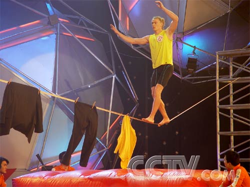 限时160秒,走在长10米,悬空2.5米的扁绳上,边走边穿,有1件外衣、1件T恤、1条裤子,不能掉下来。