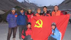 2005年5月22日,中央电视台派出由10名编辑和3名技术人员组成的报道组,对重测珠峰科学活动进行直播。在克服了难以想象的困难后,直播圆满顺利完成,反响热烈。图为报道组全体党员手执党旗在珠峰大本营。