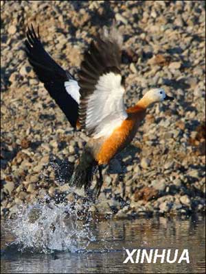 2月1日,一只野鸭在蒙古乌兰巴托西郊翩然起飞。蒙古国冬天寒冷,但穿过乌兰巴托的图拉河部分河段不封冻,大群的野鸭在这里栖息,成为寒冬里的一道风景。