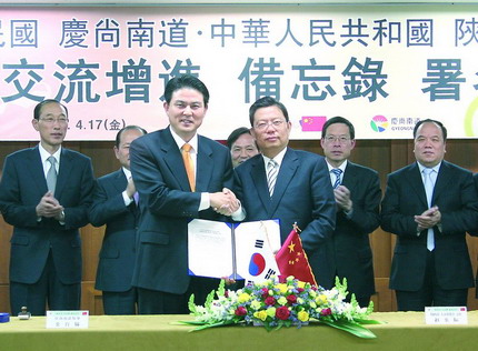 4月17日至20日,省委书记、省人大常委会主任赵乐际率我省代表团在韩国访问时,先后考察了斗山重工、韩国矿物资源公社等大型企业,会见了庆尚南道知事金台镐并共同签署了《陕西省与庆尚南道发展友好省道关系备忘录》。