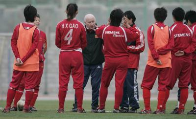 2005年1月31日,中国女足技术顾问基斯布伦特(左四)在指导女足队员训练。当日,中国女足部分队员在福建泉州进行训练,备战将于2月1日举行的四国女足锦标赛最后关键一战――中德之战。