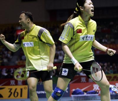2005年5月14日,中国队选手张军/高崚(右)在混合双打比赛中迎战韩国队选手李在珍/李孝贞。当日,在北京举行的第九届苏迪曼杯世界羽毛球锦标赛混合团体赛进入半决赛,中国队对阵韩国队,争夺决赛入场券。新华社记者廖宇杰摄