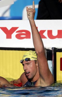 7月24日,澳大利亚选手哈克特在世界游泳锦标赛男子400米自由泳决赛中,以3分42秒91获得冠军。 新华社记者李岳摄