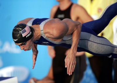 7月24日,美国选手菲尔普斯在接力比赛中出发。当日,美国队在世界游泳锦标赛男子4X100米自由泳接力决赛中,以3分13秒77的成绩获得冠军。 新华社记者李岳摄