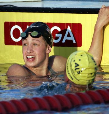 2005年7月25日,16岁的美国小将霍夫(左)在加拿大蒙特利尔举行的第十一届世界游泳锦标赛女子200米个人混合泳决赛中,以2分10秒41的成绩夺冠。 新华社记者李岳摄