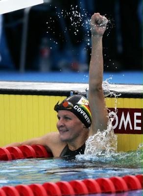 7月26日,津巴布韦选手考文垂举臂庆贺。当日,考文垂在加拿大蒙特利尔举行的世界游泳锦标赛女子100米仰泳决赛中,以1分0秒24的成绩获得冠军。 新华社记者李岳摄