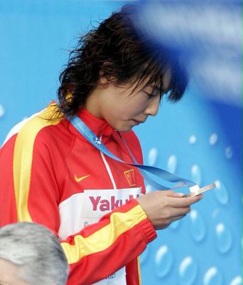 2005年7月27日,中国选手杨雨在领奖台上看奖牌。当日,杨雨在加拿大蒙特利尔举行的第十一届世界游泳锦标赛女子200米自由泳决赛中,以1分59秒08的成绩与瑞典选手里哈格并列第三。法国选手菲格斯获得冠军。 新华社记者李岳摄