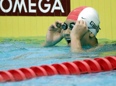 2005年7月27日,中国选手高畅抵达终点后笑逐颜开。当日,高畅在加拿大蒙特利尔举行的第十一届世界游泳锦标赛女子50米仰泳半决赛中,以28秒31的成绩晋级决赛,并打破该项目的世锦赛纪录。 新华社记者李岳摄