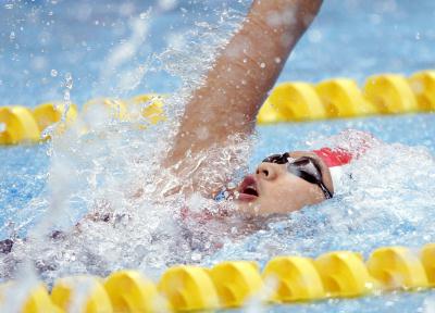 2005年7月27日,中国选手高畅在比赛中奋力拼搏。当日,高畅在加拿大蒙特利尔举行的第十一届世界游泳锦标赛女子50米仰泳半决赛中,以28秒31的成绩晋级决赛,并打破该项目的世锦赛纪录。 新华社记者李岳摄