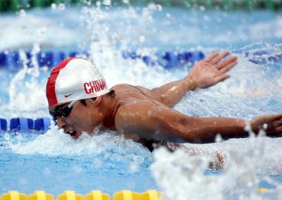 2005年7月27日,中国选手吴鹏在比赛中奋力拼搏。当日,吴鹏在加拿大蒙特利尔举行的第十一届世界游泳锦标赛男子200米蝶泳决赛中,以1分56秒50的成绩获得铜牌。波兰选手科尔兹尼奥斯基获金牌。 新华社记者李岳摄