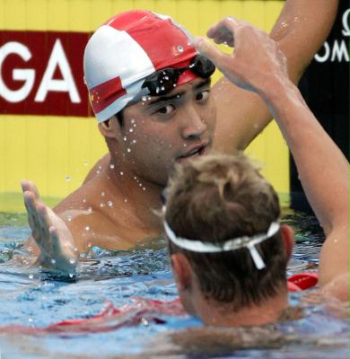2005年7月27日,中国选手吴鹏(左)在接受科尔兹尼奥斯基的祝贺。当日,吴鹏在加拿大蒙特利尔举行的第十一届世界游泳锦标赛男子200米蝶泳决赛中,以1分56秒50的成绩获得铜牌。波兰选手科尔兹尼奥斯基获金牌。 新华社记者李岳摄
