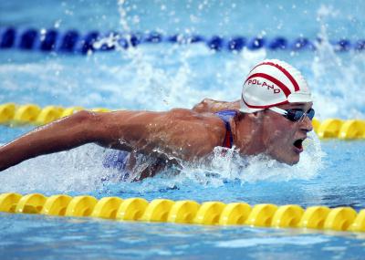 2005年7月27日,波兰选手科尔兹尼奥斯基在加拿大蒙特利尔举行的第十一届世界游泳锦标赛男子200米蝶泳决赛中,以1分55秒02的成绩获得金牌。 新华社记者李岳摄