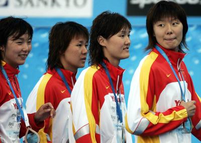2005年7月28日,中国队队员杨雨、朱颖文、庞佳颖和周雅菲(从左至右)在颁奖仪式后退场。当日,中国队在加拿大蒙特利尔举行的第十一届世界游泳锦标赛女子4X200米自由泳接力决赛中,以7分57秒29的成绩获得铜牌。 新华社记者李岳摄