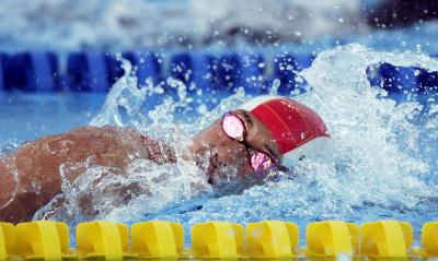 2005年7月28日,中国队第一棒选手朱颖文在比赛中。当日,中国队在加拿大蒙特利尔举行的第十一届世界游泳锦标赛女子4X200米自由泳接力决赛中,以7分57秒29的成绩获得铜牌。 新华社记者李岳摄
