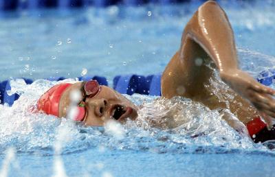 2005年7月28日,中国队第二棒选手庞佳颖在比赛中。当日,中国队在加拿大蒙特利尔举行的第十一届世界游泳锦标赛女子4X200米自由泳接力决赛中,以7分57秒29的成绩获得铜牌。 新华社记者李岳摄