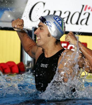 7月28日,意大利选手马格尼尼夺冠后欣喜若狂。当日,马格尼尼在加拿大蒙特利尔举行的第十一届世界游泳锦标赛男子百米自由泳的“飞鱼大战”中,以48秒12的成绩夺冠。 新华社记者李岳摄