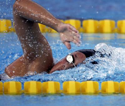 7月28日,美国队第四棒队员桑德诺在比赛中。当日,美国队在加拿大蒙特利尔举行的第十一届世界游泳锦标赛女子4X200米自由泳接力决赛中,以7分53秒70的成绩折桂。 新华社记者李岳摄