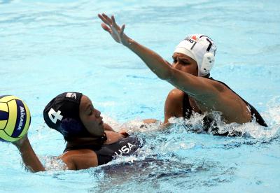 2005年7月29日,匈牙利队队员(右)在比赛中防守。当日,匈牙利队在加拿大蒙特利尔举行的第十一届世界游泳锦标赛女子水球决赛中,通过加时赛以10比7战胜美国队,赢得桂冠。 新华社记者李岳摄