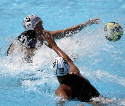 2005年7月29日,双方队员在比赛中拼抢。当日,匈牙利队在加拿大蒙特利尔举行的第十一届世界游泳锦标赛女子水球决赛中,通过加时赛以10比7战胜美国队,赢得桂冠。 新华社记者李岳摄